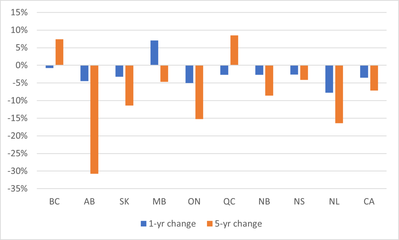 As far as in Canada, Alberta is at the bottom for education spending and near the bottom for health spending.