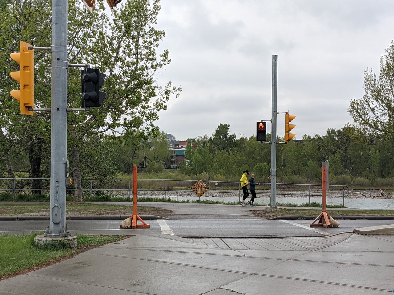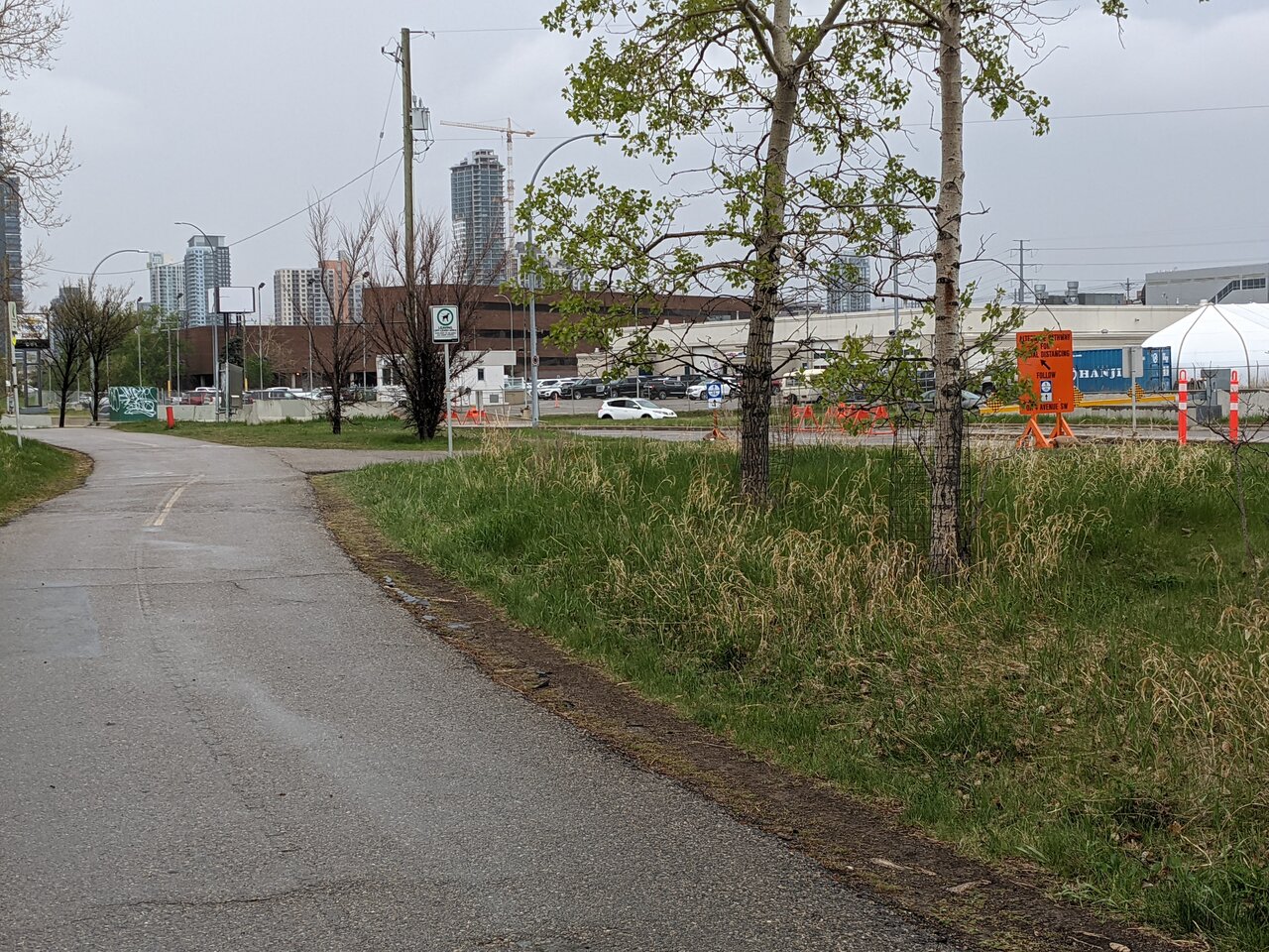 From the west end, it's worse; the arrow also points away from the road, but you also have to backtrack to go onto the road from the main pathway connecting from the Crowchild bridge. This is what it looks like (as you approach at 15+ km/h):