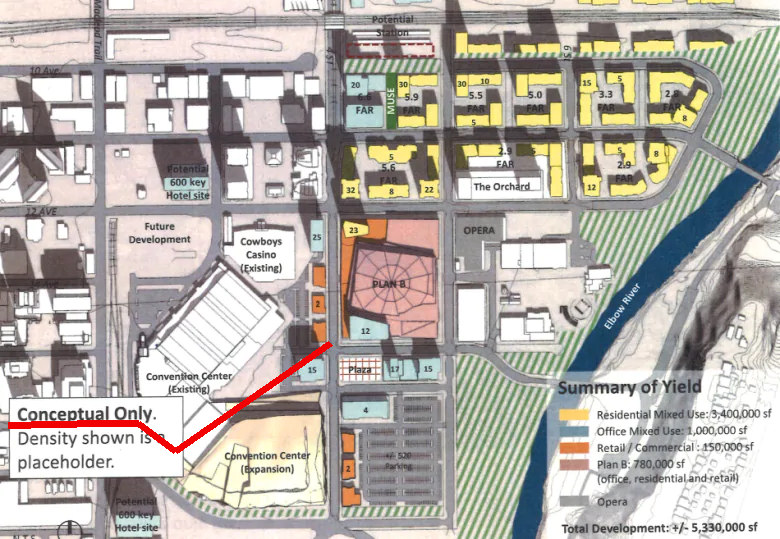 I like the whole idea of what they are trying to do. My one change would be to try and have 17th ave extended into the grounds and come through the centre of the BMO centre, and then angle right in toward a future arena. Might not be possible, but it would be a more organic passage, and also come right into the corner of a new arena. Could be pretty cool.