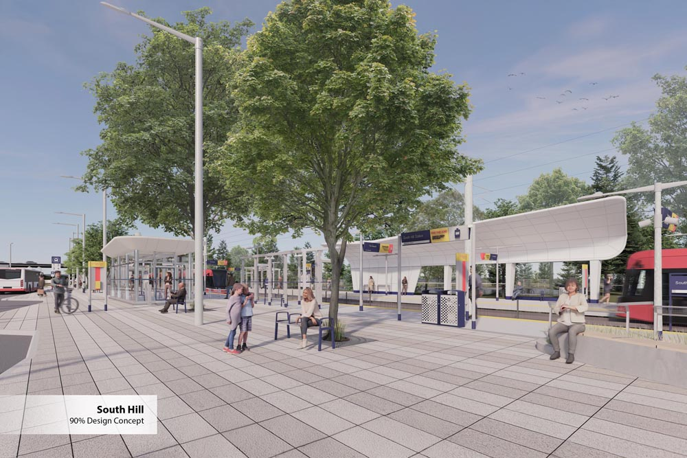 90% design has been completed for the southeast, and some new renders are on the Green Line website. Note how the stations with bus loops have seamless level integration with the platform and the bus bays.