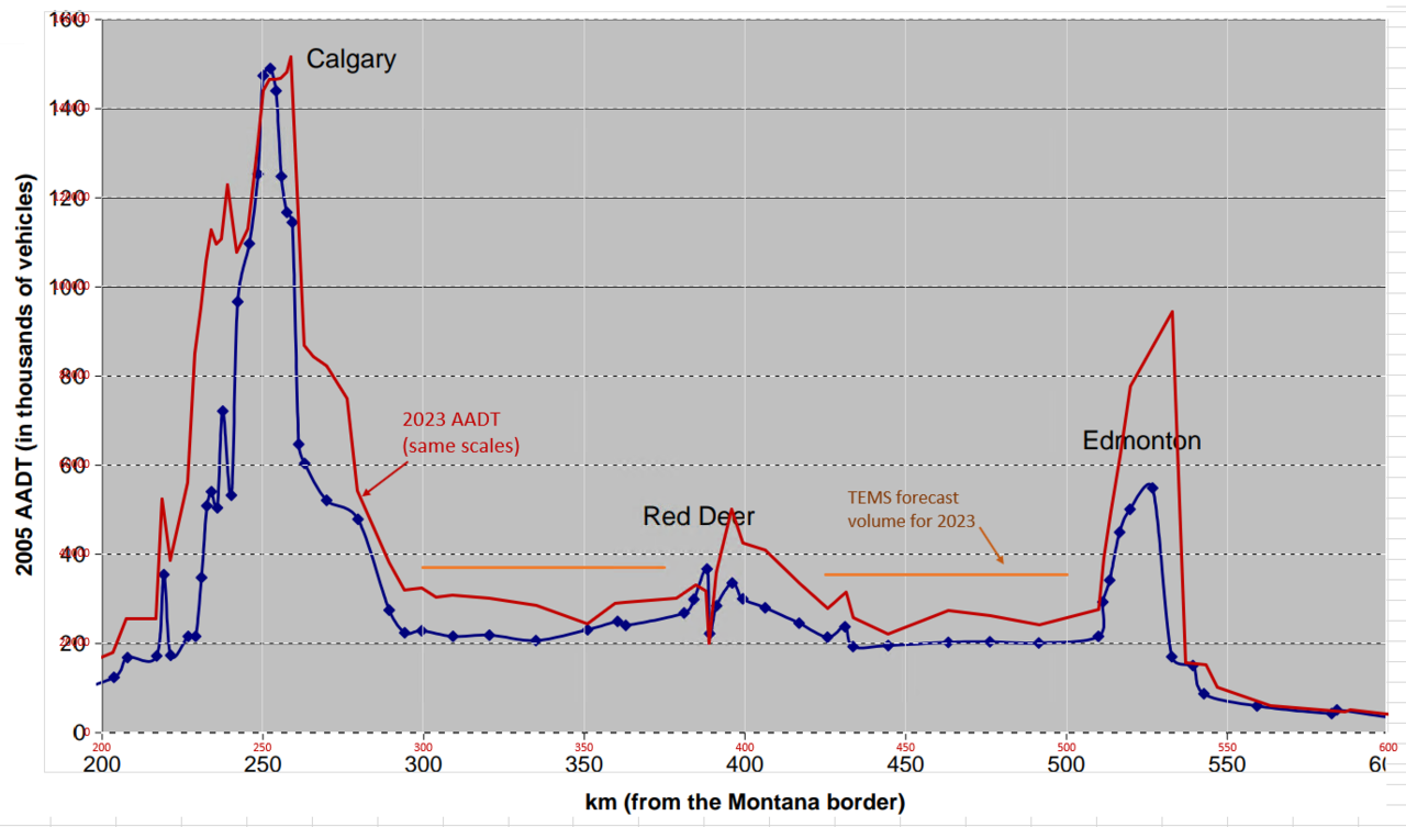 What's interesting is there are some areas with really substantial growth; in the approaches to Calgary (the peak at 150K is the same; Deerfoot between McKnight and Glenmore was full in 2006 and remains full today), the approach to Edmonton from the south, as well as from north of Red Deer into town. But there's much less growth on the true inter-city portion that HSR is intended to serve; the 2023 volume is up from 20 to 22K at Lacombe, from 20 to 24K at Wetaskiwin (km 491) and Olds (km 351); it's actually lower at the Red Deer bypass at Taylor Drive, only 20K today.