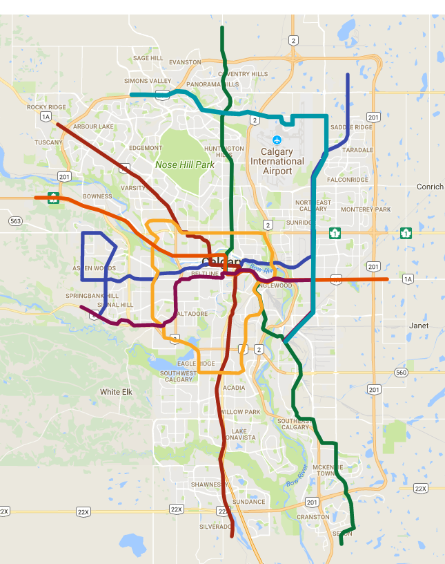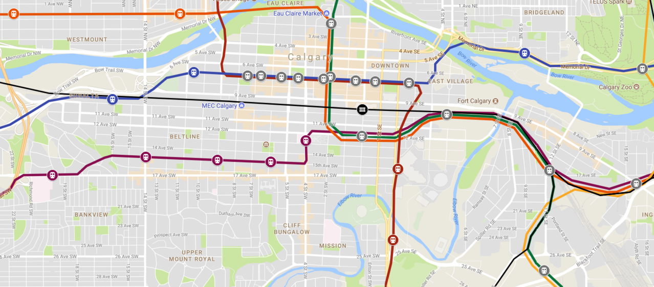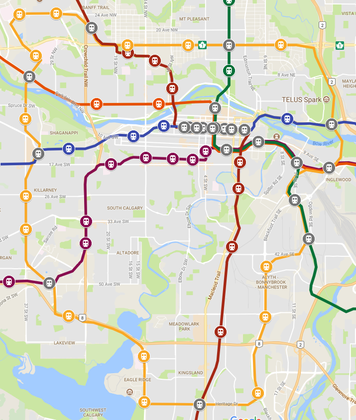 @Silence&Motion 's Orange Line, my orange line also goes out towards Bowness in the West. The big difference is that is passes along the Trans Canada rather than through the communities. It has a station right at Winsport and a terminus at Valley Ridge. The central portion is novel though. Rather than going along 16th Ave. N like the other lines, it instead continues to hug the river and ultimately goes up Kensington Road. Probably not the most feasible thing to accomplish cost effectively, but I really like the idea of a C-Train that passes through Kensington. Also expensively, it then tunnels under the river and joins up with the Green Line until Ramsay. At which point it sails along 17th Ave SE to the edge of town. Another apparently popular line choice.