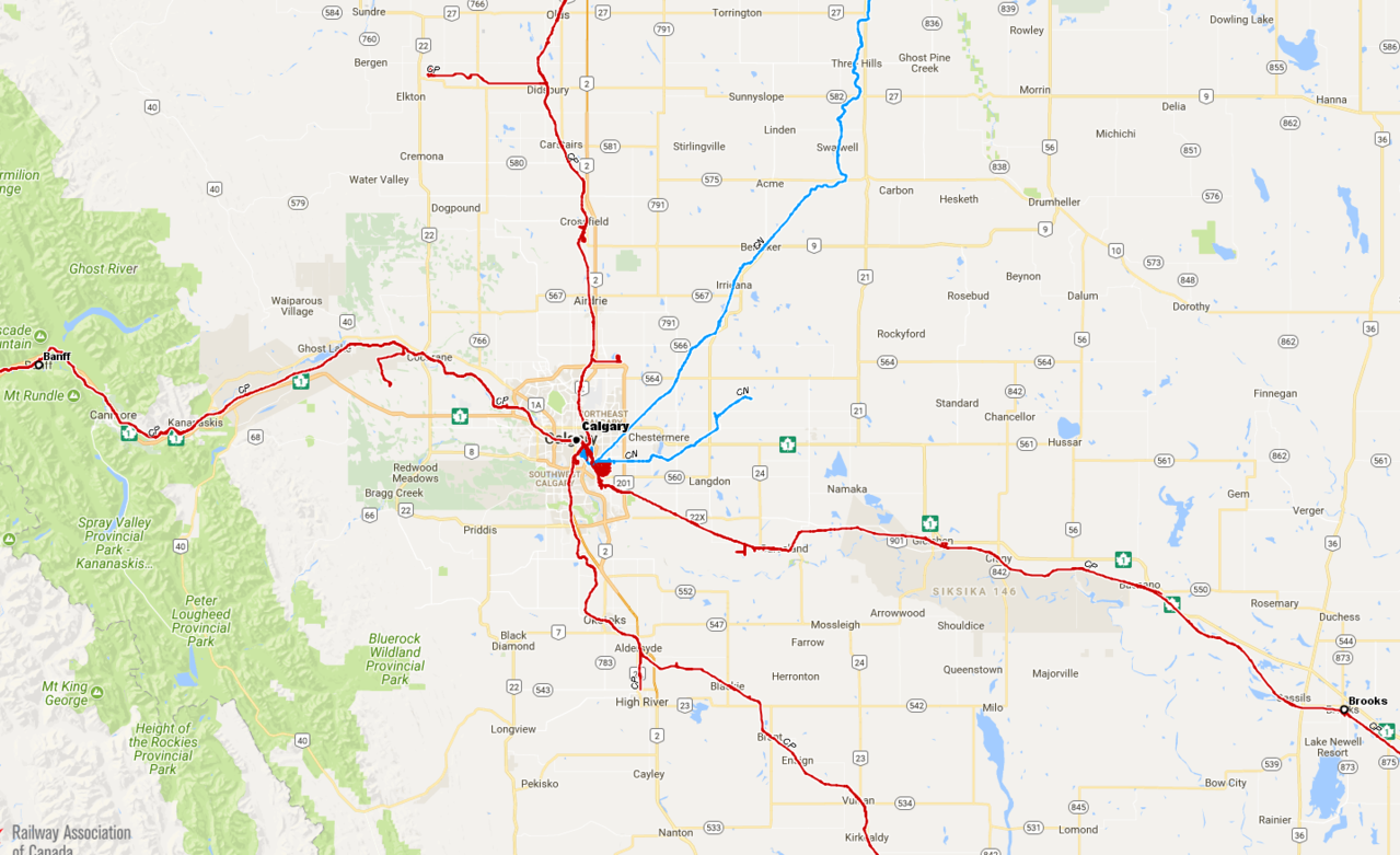 I did it up fantasy stiles going as far as Nanton, Banff, Red Deer and Strathmore hitting up most stops along the way. Realistically, demand would drive how far the lines would run and how frequently it stops. The central station also invisages blowing up the parking garages around the Calgary Tower and in a sense elaborates on an Crazy Dream Idea I had for re imagining the Tower as a transportation focal point and starting point for visitors to the city. There are also four cardinal point stations in or near the city at Bowness, Chestermere, Dewinton and the aforementioned North Calgary station in the Sky Blue Line.
