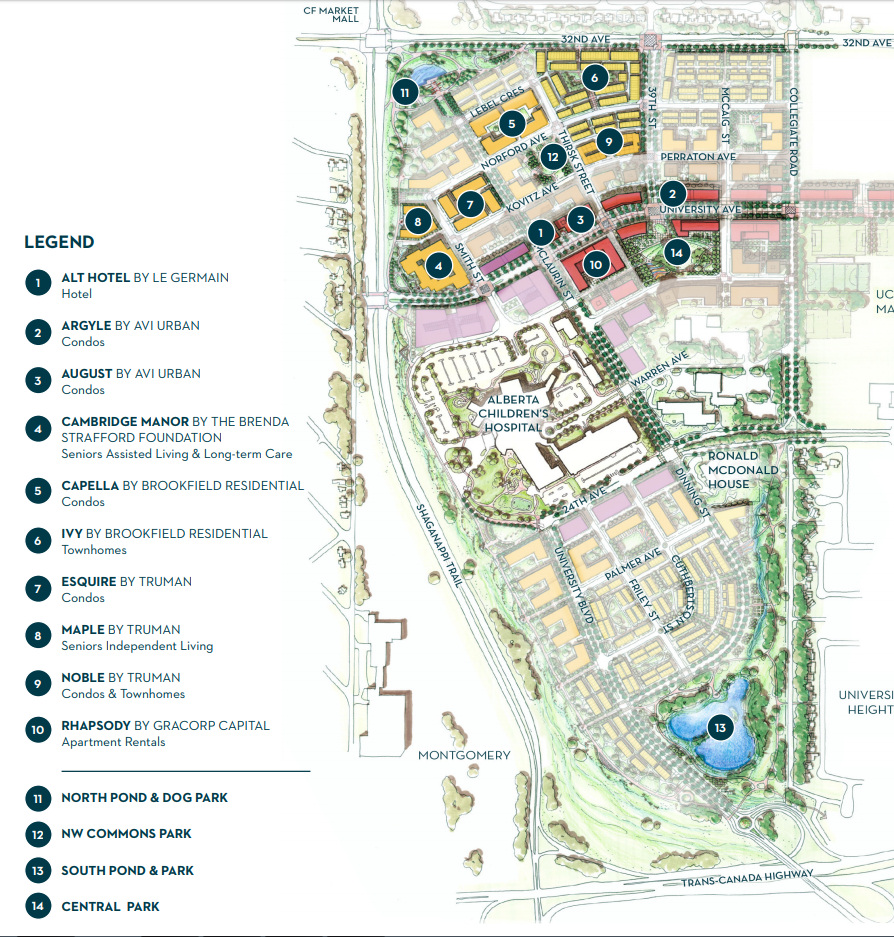 The biggest change I'm seeing is they are doing a land swap with the University, trading Area 1 in the below image for the remaining portions of Area 3 that the University was previously holding onto. This means the main street won't extend any further than the currently under construction Autumn. They mention that Area 1 aligns with campus expansion plans; hopefully something that also involves that giant parking lot to the north!