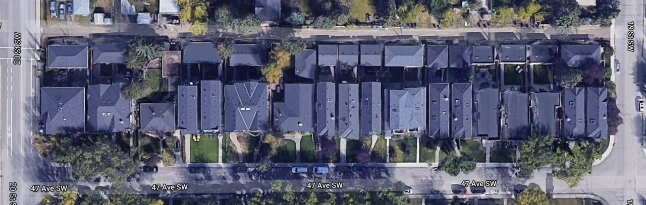 For example, tiny backyards, huge front lawns, one bungalow left on the street to dictate the setback (Altadore):