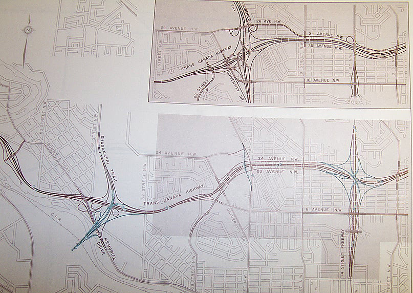 Probably the most destructive section for both what existed when proposed and what would come in future decades. Looks like two options were considered for TransCanada and Crowchild intersections. Both would have removed much of Banff Trail and Mount Pleasant. You can see one part that was already built in anticipation for this system, in the weird 14th Street and 16th Ave interchange that still stands today.