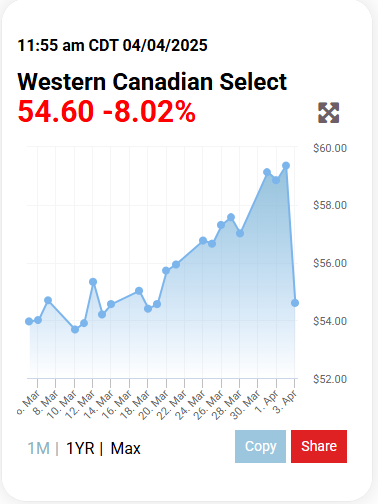 It's the decline of global oil prices, Canadian oil is actually holding its price much better than global benchmarks. WCS/WTI (US/Global Benchmark) is actually at it's narrowest in a while. As of now, WTI is about $60.92 and WCS is $52.57, discount of $8.35. For context, this was the Budget 2025 differential forecast,