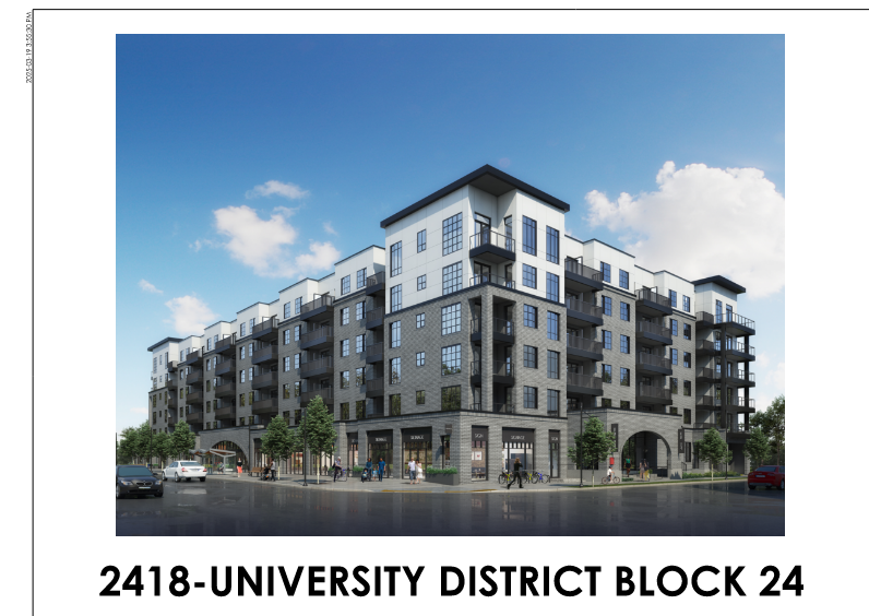 Another new Truman DP for University District, apparently being called "2418" for now. This is for the site immediately east of the building with the Cineplex. Architect is Casola Koppe. Gets the big things right IMO - CRU's lining the entire University Ave frontage, decent massing and high quality materials with mostly brick. It seems like developers in UD are incapable of producing crap (and that's a good thing!). View attachment 640091