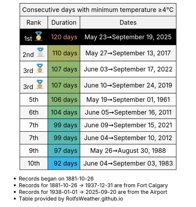 I remember back when I took horticulture in high school, we were taught the average number of frost free days for Calgary was 105. It could have been information that was carried forward a few decades, but either way, it's safe to say we are well past that.. I'd be curious to see the last time we had a frost free run of 105 days or less.